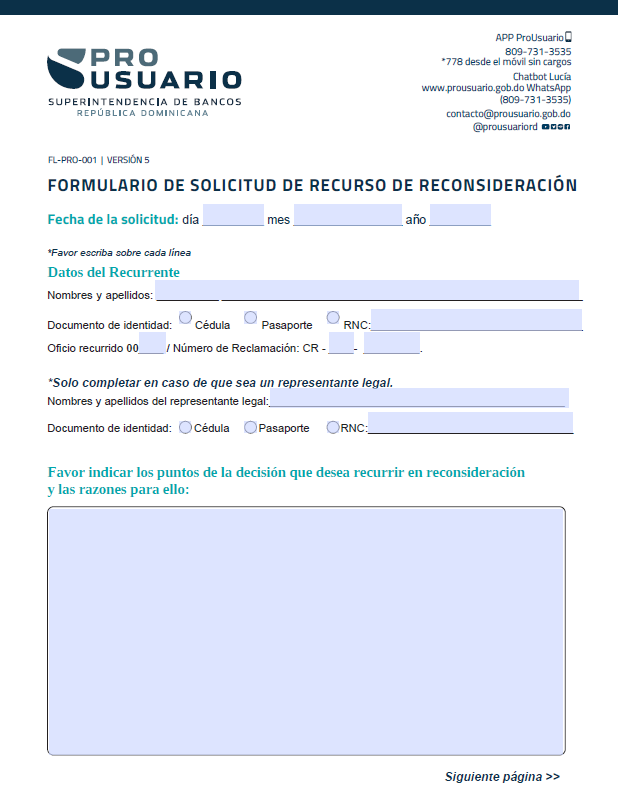 Escribiendo a nuestro correo contacto@prousuario.gob.do incluyendo todos los requisitos solicitados y una breve explicación del caso. Estaremos contactándote en un plazo de 48 horas laborables.